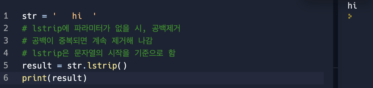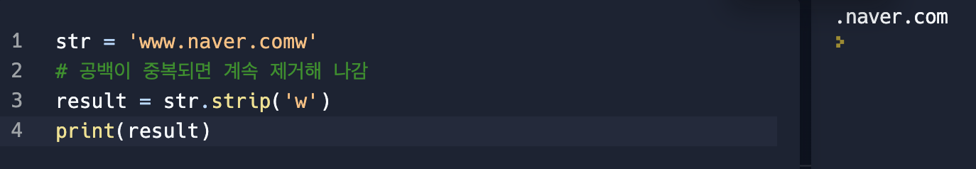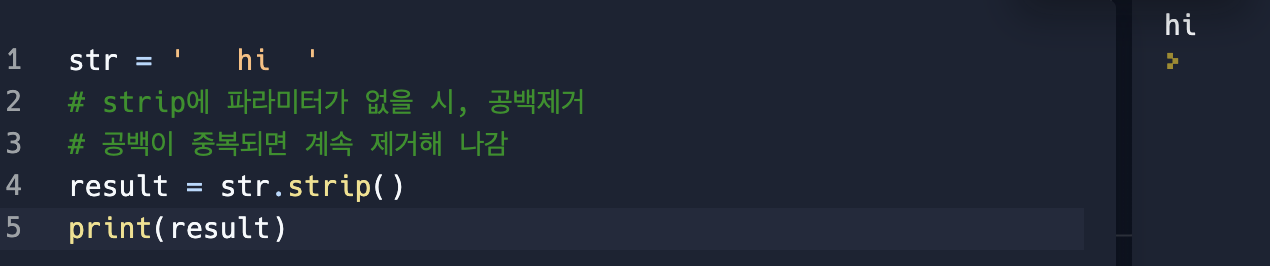 strip()은 문자열의 시작, 끝 모두 반영됩니다. 파라미터로 들어온 문자를 문자열 시작과 끝에서부터 제거합니다. 파라미터가 비어있으면 공백을 제거 합니다. 파라미터로 들어온 문자가 문자열의 시작과 끝에서 중복으로 선언되어있으면, 중복이 끝날 때까지 제거해줍니다.