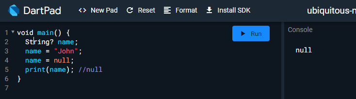 즉, null safety 는 nullable 변수를 선언하는 것과 같습니다.