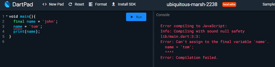 var 대신 final 키워드를 사용하여 변수를 만들게 되면 이 변수는 업데이트 될 수 없습니다. 자바스크립트에서 사용하는 const와 비슷한 역할을 합니다.