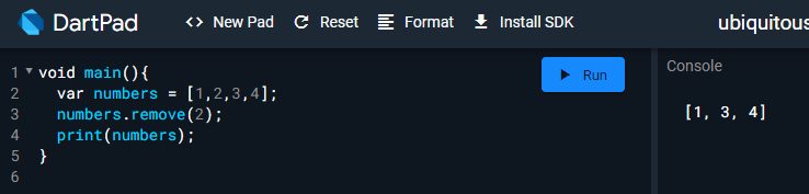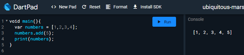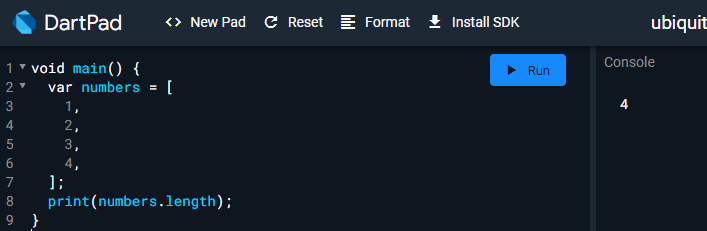 dartpad 에서 사용할 떄는 Format 버튼을 클릭하면 여러줄로 포매팅 됩니다. 코드의 가시성을 위해 참고하시기 바랍니다.