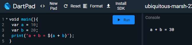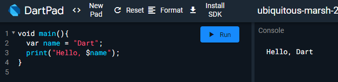 위 코드는 name 변수에 "Dart"라는 값을 할당하고, print 함수를 사용해 "Hello, Dart"라는 문자열을 출력합니다. $ 문자를 사용하여 변수나 상수를 문자열 내에 삽입할 수 있습니다.