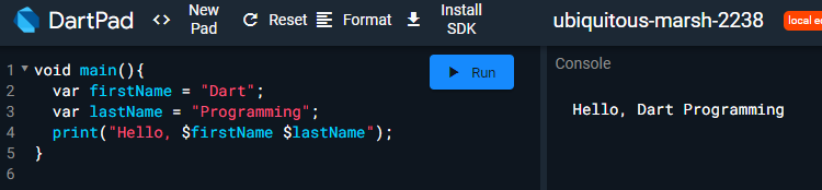 위 코드는 firstName과 lastName 변수를 문자열 내에 보간하여 "Hello, Dart Programming"라는 문자열을 출력합니다.