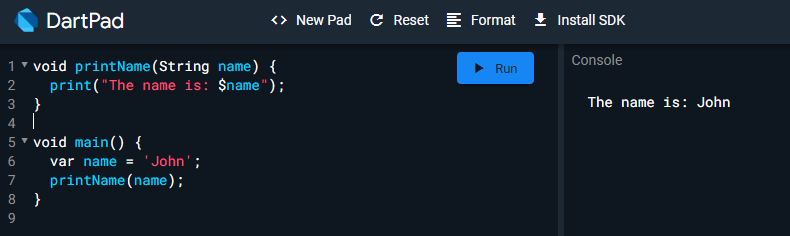 위 'printName' 으로 명시된 함수는 문자열 타입의 파라미터를 전달받고, string interpolation을 활욯해 $기호에 변수를 전달하여 출력합니다. return_type은 void로, void 는 반환 값이 없는 형태입니다.
