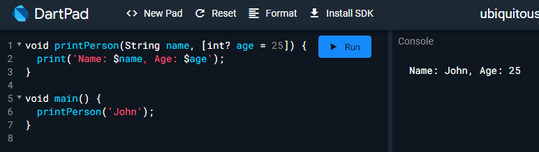 void printPerson(String name, [int? age = 25]) {