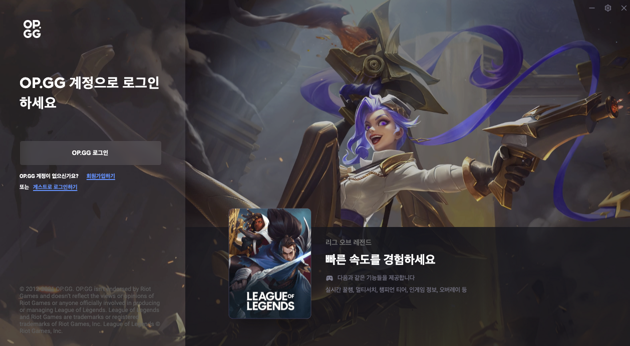 OP.GG 계정이 없어도 동작하기 때문에, 게스트로 로그인하기 하셔도 됩니다. 그러면 op.gg에서 본 익숙한 화면이 나오고, 준비가 되었습니다.
