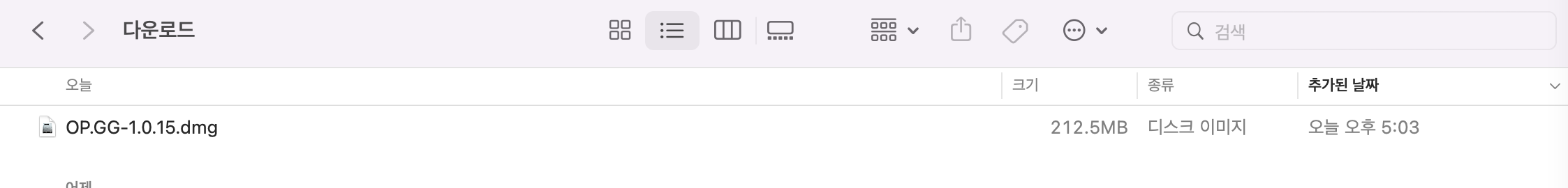 왼쪽 항목에서 응용프로그램을 클릭한 후, OP.GG를 찾아 control + 마우스 click 하면 아래와 같이 나옵니다. 이때 열기를 선택합니다.