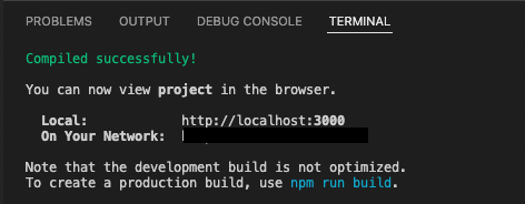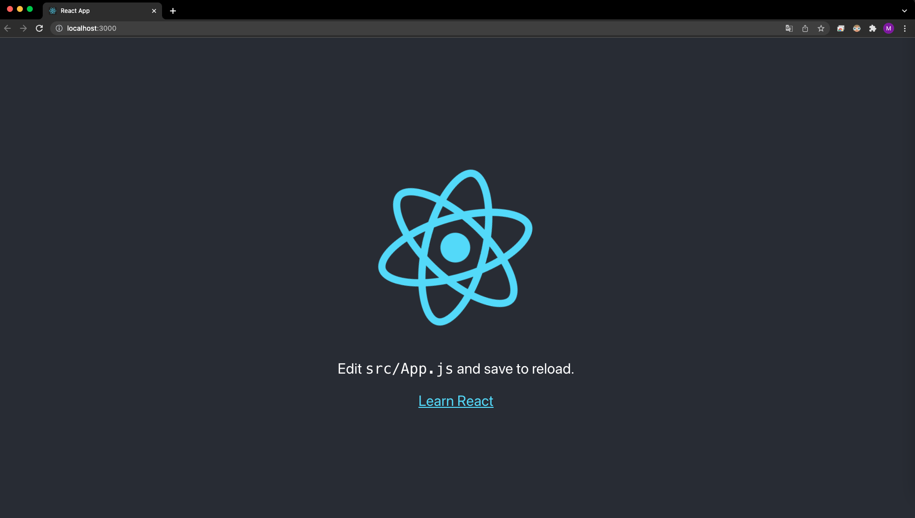 npm start를 입력하면 어떠한 경고창이 뜨고 허용 해주시면됩니다. (캡쳐를 못했습니다 ㅠㅠ). 그러면 compiled successfully! 가 뜨고, 인터넷 브라우저에서 아래와 같이 뜨면 성공적으로 react project 가 생성된 것입니다.