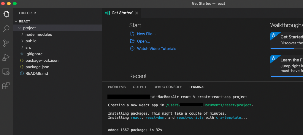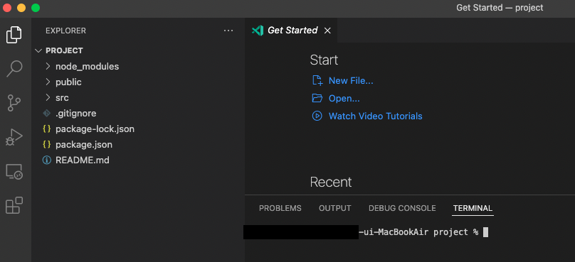 왼쪽 폴더를 보면 이제 react 가 아닌 project 가 가장 상위단이 되었습니다. 터미널의 경로도 project로 변경되었습니다.