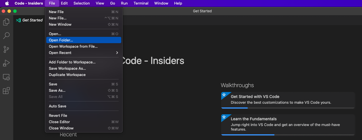 먼저 원하는 위치에 앞으로 소스코드를 저장할 폴더를 하나 만든 후, Open Folder 를 클릭한 후 해당 폴더를 선택해 줍니다.