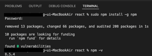 sudo 를 포함해서 명령어를 실행시키면 비밀번호를 입력하는 부분이 나옵니다. 이 비밀번호는 맥북 로그인할 때 쓰는 비밀번호를 입력하시면 됩니다. npm을 업그레이드 한 후 버전을 확인(npm -v)해보니 8.5.4 버전으로 잘 업그레이드 되었습니다.
