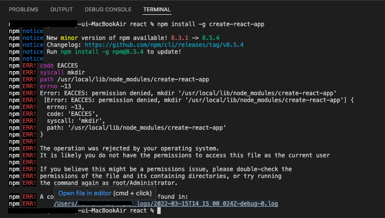 자 이제 아래 명령어를 VSCode 터미널에 입력하여 create-react-app 을 설치합니다. -g 는 global 옵션으로 모든 프로젝트에서 사용할 수 있게 하는 옵션입니다.