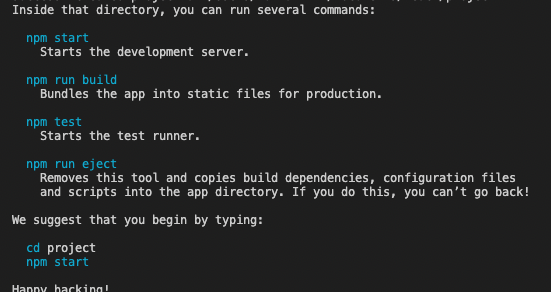 create-react-app 을 설치했으니 테스트를 해봅시다. react-create-app 을 설치하면, 아래의 명령어로 리액트 앱을 생성할 수 있습니다. 'project' 로 쓰여진 부분은 원하는 이름으로 변경하셔도 됩니다.