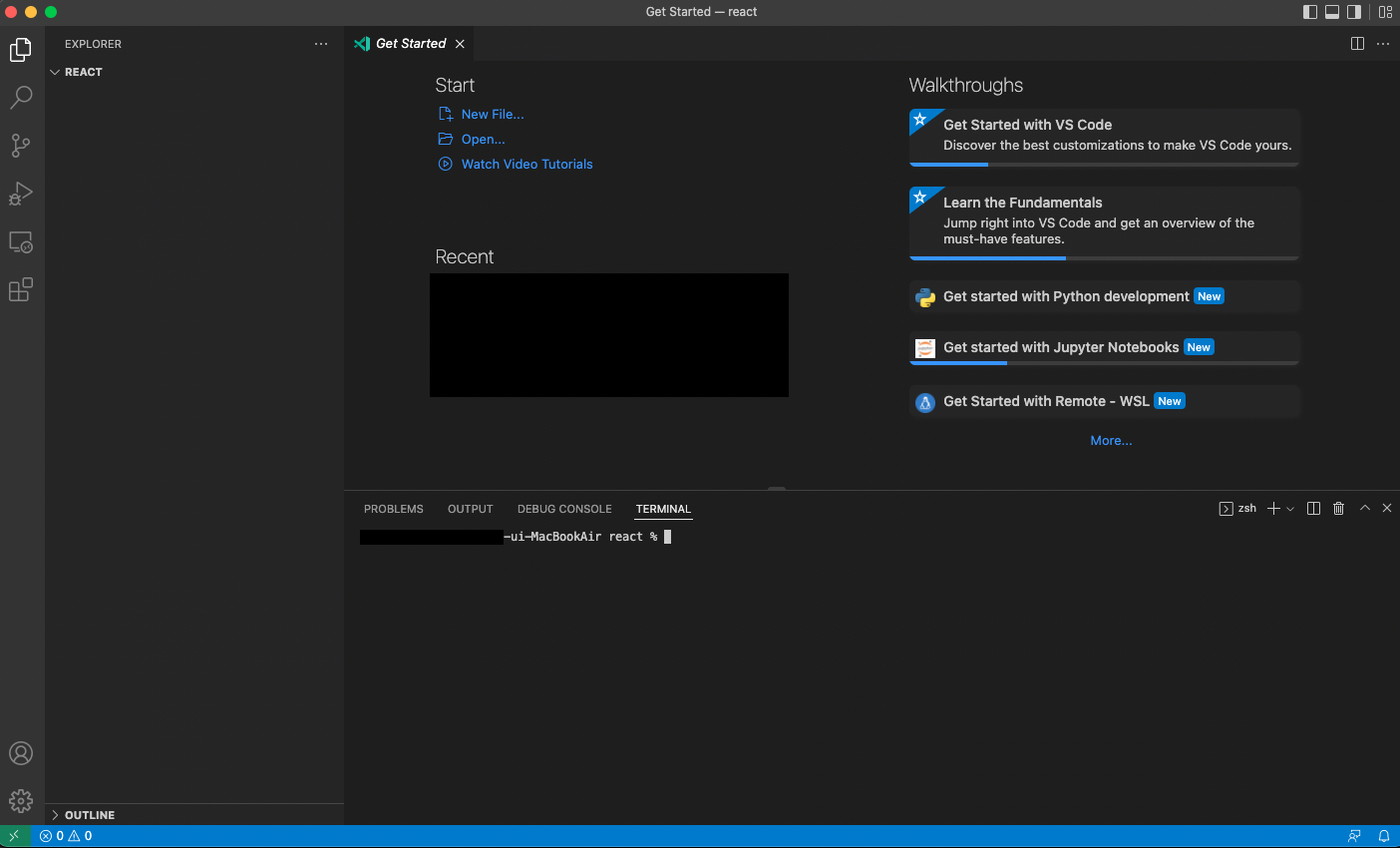 저는 폴더를 react 로 생성하고 open 한 상태입니다. 이상태에서 View - Terminal을 선택해줍니다.
