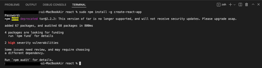 이제 다시 create-react-app 를 설치해보겠습니다. 위와 같이 앞에 sudo 를 붙이고, 비밀번호를 입력해줍니다.