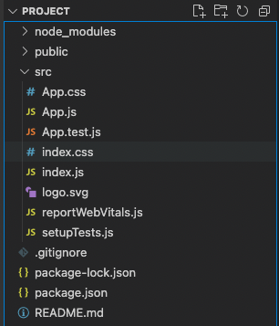앞서 react-create-app 을 사용하여 project를 생성한 후, npm start 를 통해 간단히 테스트 해보았습니다. 먼저 프로젝트를 생성하면 폴더 내에 여러 파일이 생성됩니다.