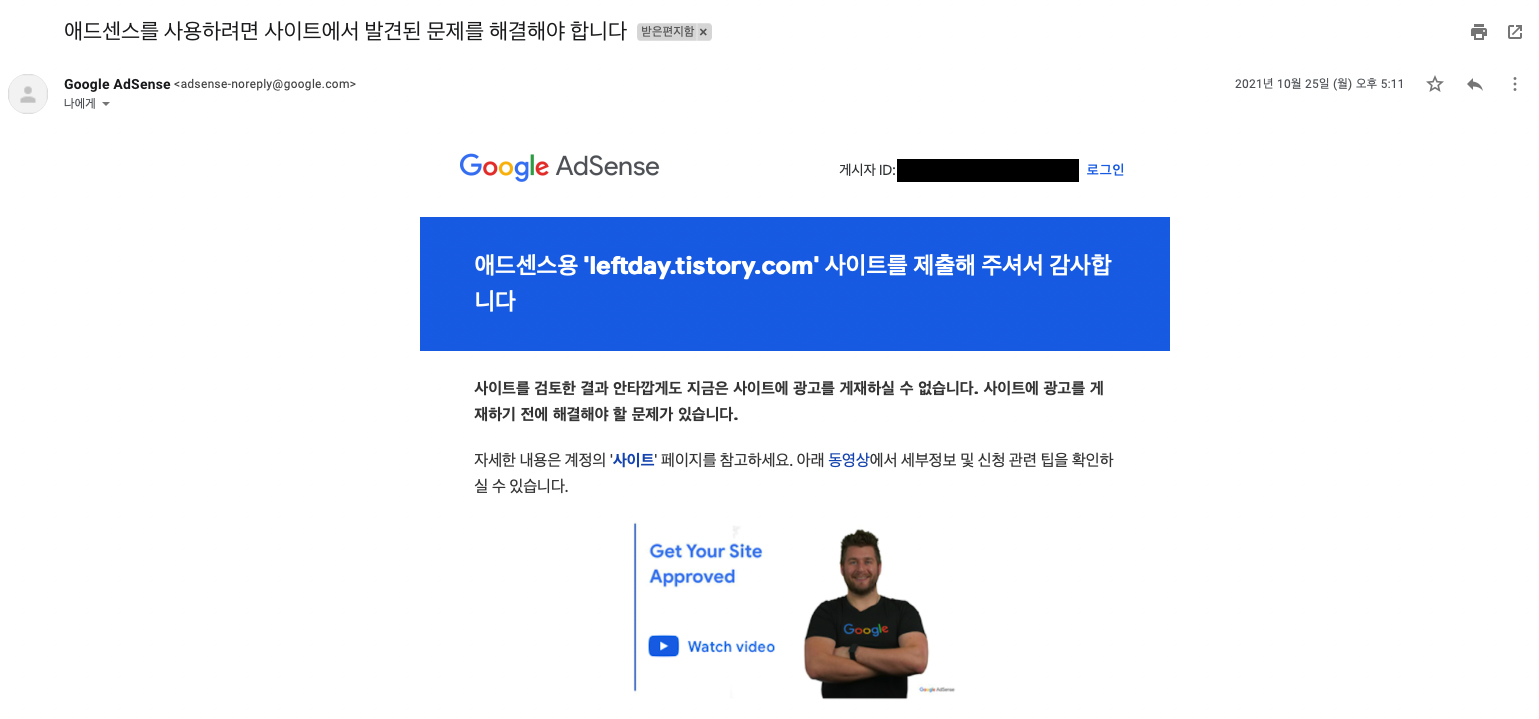 기록을 습관화 하기 위해 블로그를 시작했지만 그래도 수익이 나면 기쁠 것 같아 구글 애드센스를 신청했습니다. 작년에 블로그를 좀 쓰다가 몇몇 게시글 덕분에 조회수도 쌓이고 하다보니 구글 애드센스를 신청했었는데, 보기좋게 떨어졌습니다.
