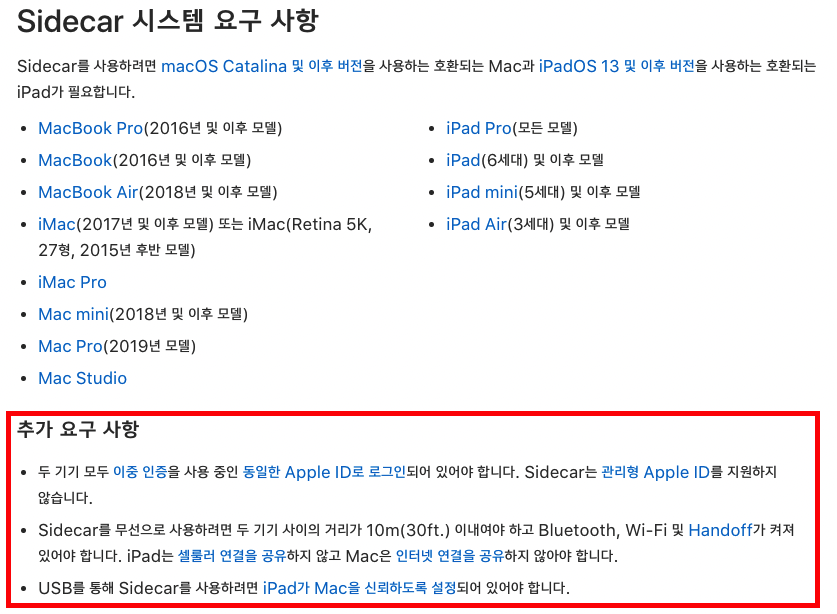 사이드카를 사용하기 위해서는 이를 지원하는 맥북과 아이패드가 필요합니다. 시스템 요구사항은 아래와 같습니다.