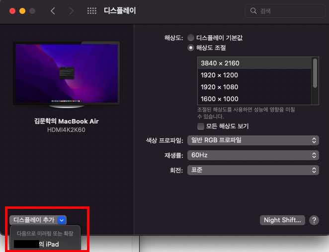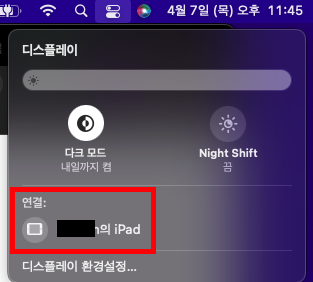 디스플레이를 누르면 연결 항목에 연결 가능한 아이패드의 목록이 나옵니다. 이를 누르면 바로 실행됩니다.