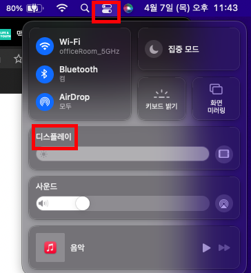 이보다 더 쉬운 방법이 있습니다. 우측 상단에서 제어센터를 열어줍니다. 제어 센터에서 디스플레이를 누릅니다.