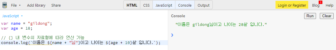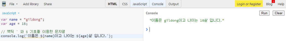 - $ 달러 기호를 이용한 템플릿 스트링 표기 방법