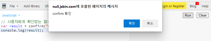 confirm(메세지); 형태로 쓰이며 메세지를 출력하고 확인, 취소 버튼이 보이는 팝업창이 뜹니다.