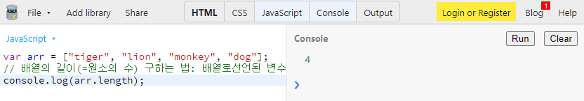 위 arr 배열의 길이(=원소의 개수)는 총 4개입니다.