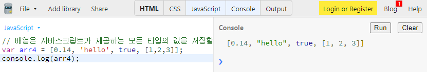 배열은 자바스크립트가 제공하는 모든 데이터 타입의 값을 저장할 수 있습니다.