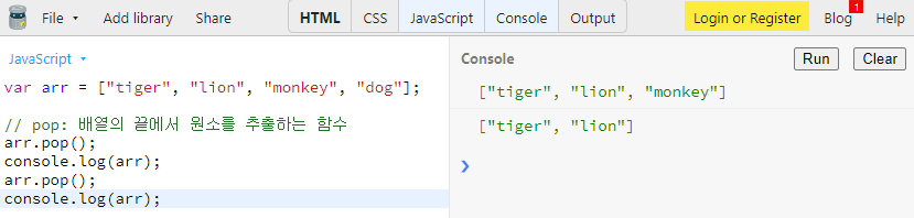 pop은 배열의 끝에서부터 데이터를 추출합니다.