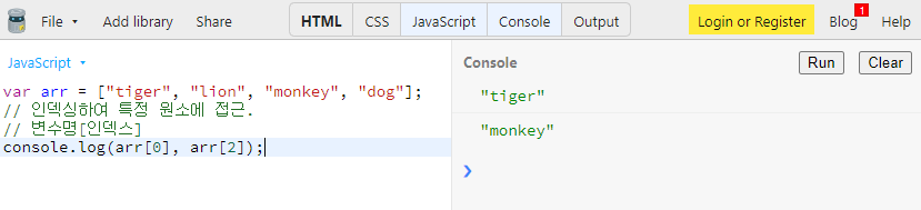 // 인덱싱하여 특정 원소에 접근.
