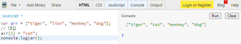 arr[1]의 원래 원소는 "lion" 인데, 여기에 "cat"을 새로 대입해준 결과입니다..