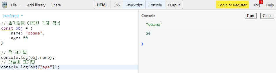 new 키워드로 Object를 선언할 수도 있지만 일반적으로 중괄호를 이용한 객체 리터럴(object literal) 형식으로 객체를 생성합니다.