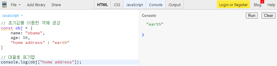 만약에 키를 문자열로 선언하여 띄어쓰기를 포함할 경우, 점 표기법으로 접근할 수 없습니다. 이때 대괄호 표기법으로 사용하면 됩니다.