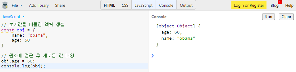 객체의 원소를 수정할 때는 점 표기법 혹은 대괄호 표기법으로 원소를 접근 한 후 데이터를 대입하면 됩니다.