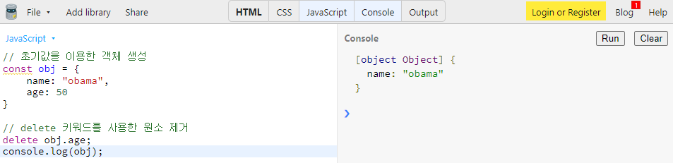 객체의 원소 키와 값을 모두 삭제하고 싶을 때는 delete 키워드를 사용하면 됩니다.