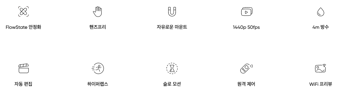 주목할만한 스펙은 광각, 본체 26g 의 가벼움, 최대 1440p 50fps 지원, 4m 방수, 손떨림 방지 및 수평 유지 등이 있습니다.