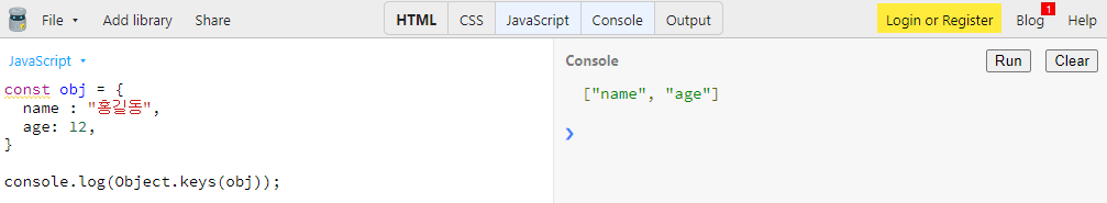 Object.keys(obj) 를 실행하면 obj 객체 안의 모든 키값들을 배열로 리턴합니다.