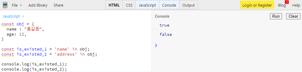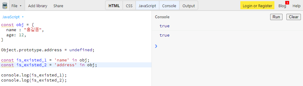 hasOwnProperty 함수를 사용하여 스스로 정의한 프로퍼티에 한해 특정 키의 소유 여부를 반환하는 방법입니다.