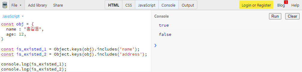 const is_existed_1 = Object.keys(obj).includes('name'); // name 키값 존재, true