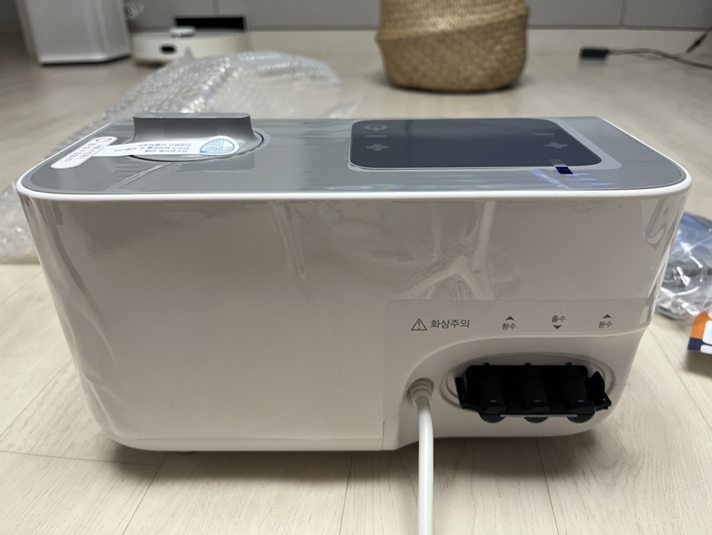 침대에 올리기 전 평평한 곳에서 매트의 물 순환을 위해 시험운행을 권장하고 있습니다. 위 커버를 연 후 물을 채워줍니다. 물은 2~3리터 정도 들어갑니다.