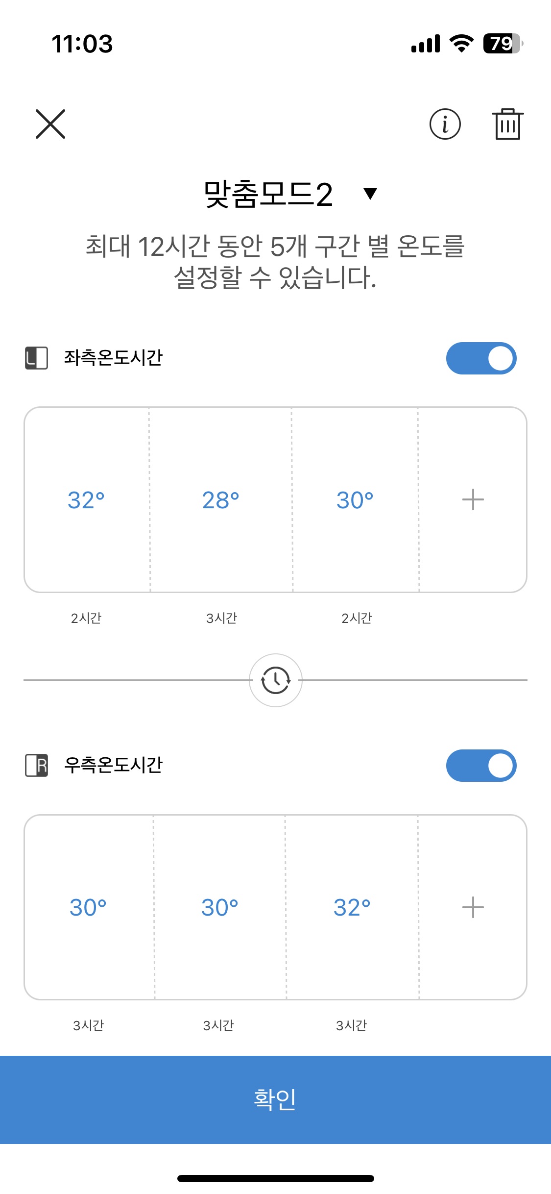 보다 디테일한 설정은 예약 탭에서 맞춤설정을 통해 할 수 있습니다. 시간에 따라 온도 설정이 가능하고, 좌우 별도로 조절할 수 있는 점이 가장 큰 강점입니다.