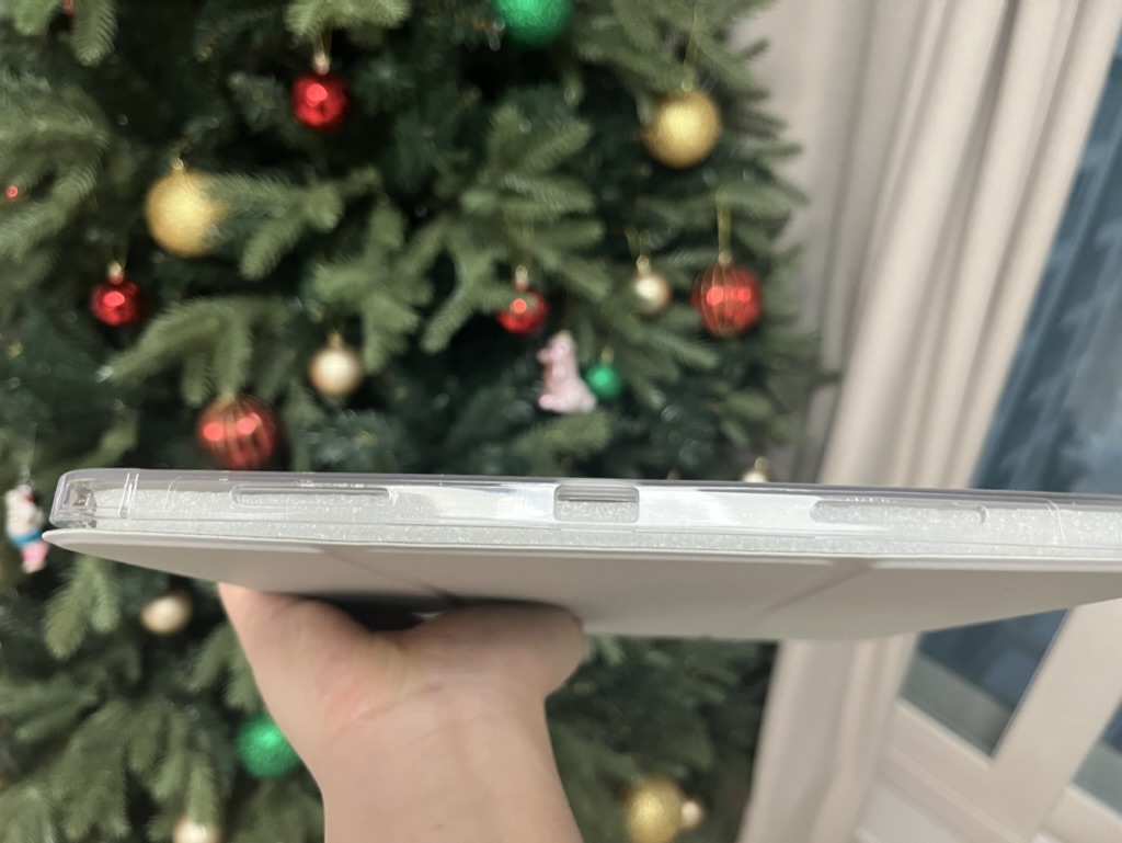 타이핑모드는 안정감 있게 잡아주지만, 뷰어 모드는 좀 불안합니다. 아이패드프로 12.9인치 자체가 커서 이기도 하지만, 덮개와 후면부간 떨어져 있기 때문에 지지력이 약한 편입니다. 뷰어 모드로 사용할 때 거치 부분이 무너져 아이패드가 종종 쓰러졌던 경험이 있네요.
