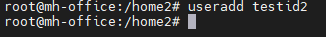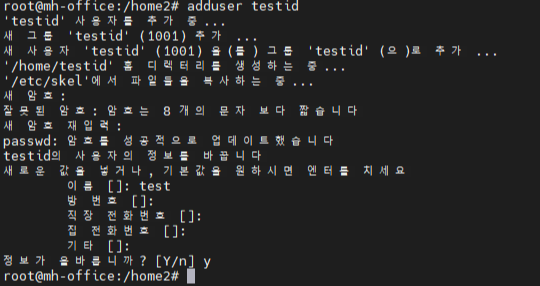 위 명령어와 같이 입력하면, adduser와 달리 별다른 암호 및 설정없이 완료됩니다.