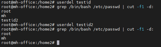 userdel 명령어를 사용하여 계정 삭제 후 확인해 보면 testid와 testid2 모두 삭제된 것을 확인할 수 있습니다.