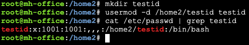 리눅스 계정을 생성할 때 adduser 를 이용하셨다면, 기본적으로 /home 아래에 새로운 계정명의 디렉토리가 생성되고, 새로운 계정의 홈 디렉토리가 설정됩니다. 이를 새로 지정해 주기 위해 usermod 의 -d 옵션을 사용하여 변경합니다.