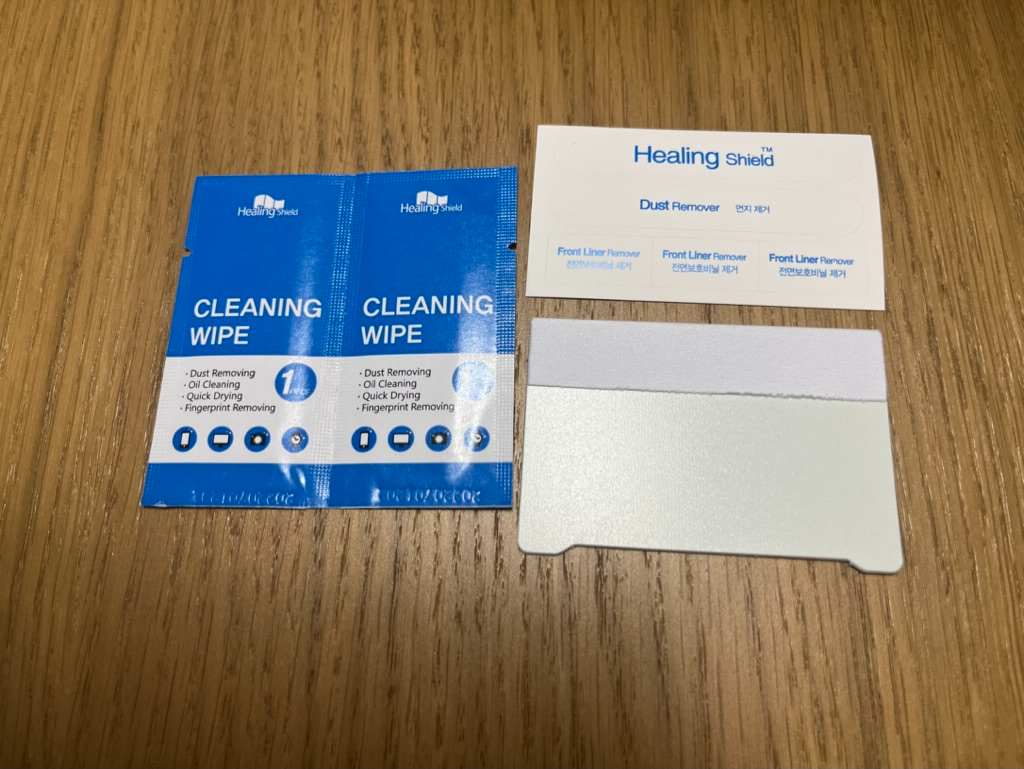 포장 안에는 강화유리와 액정 닦을 물티슈, 기포제거제가 있습니다.