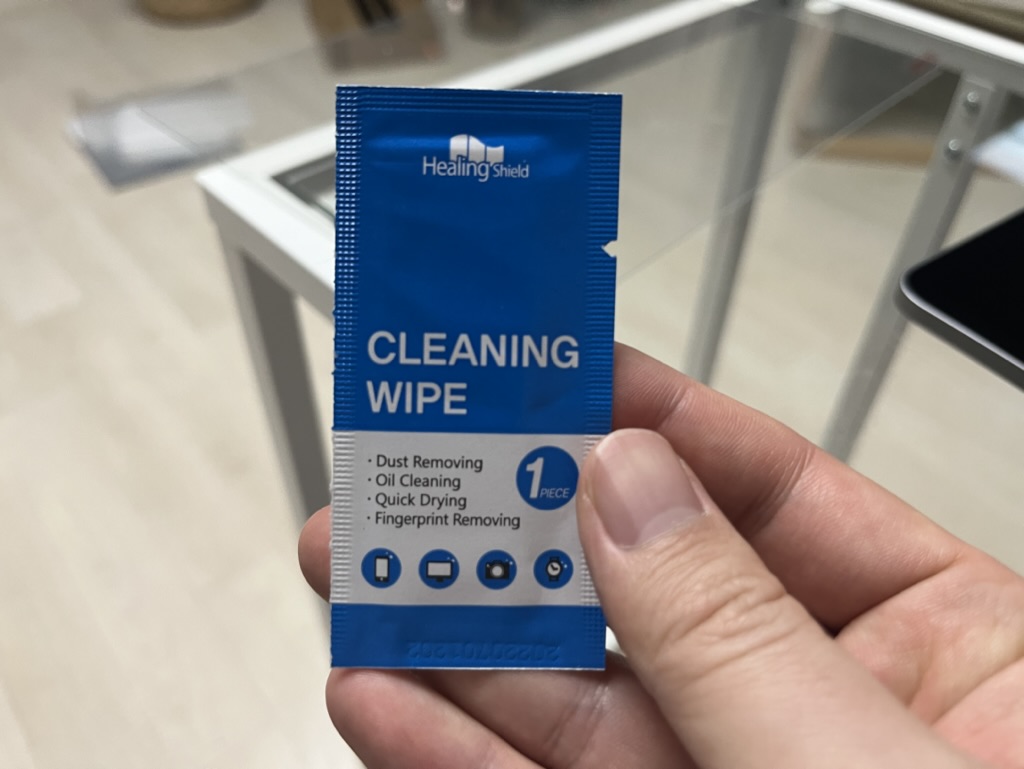 유리를 부착하기 전 물티슈로 깨끗히 닦아줍니다.