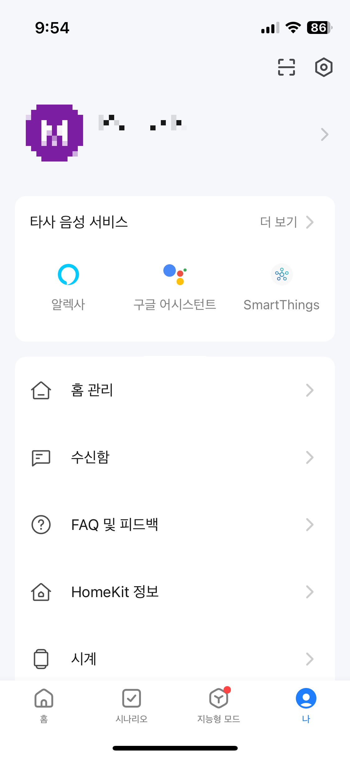 연결을 완료한 후, 아래 메뉴 텝에서 '나' 로 이동하면 타사 음성서비스를 연동할 수 있습니다. 연결 가능한 음성서비스는 알렉사, 구글어시스턴트, 스마트싱스, IFTTT 가 있습니다.